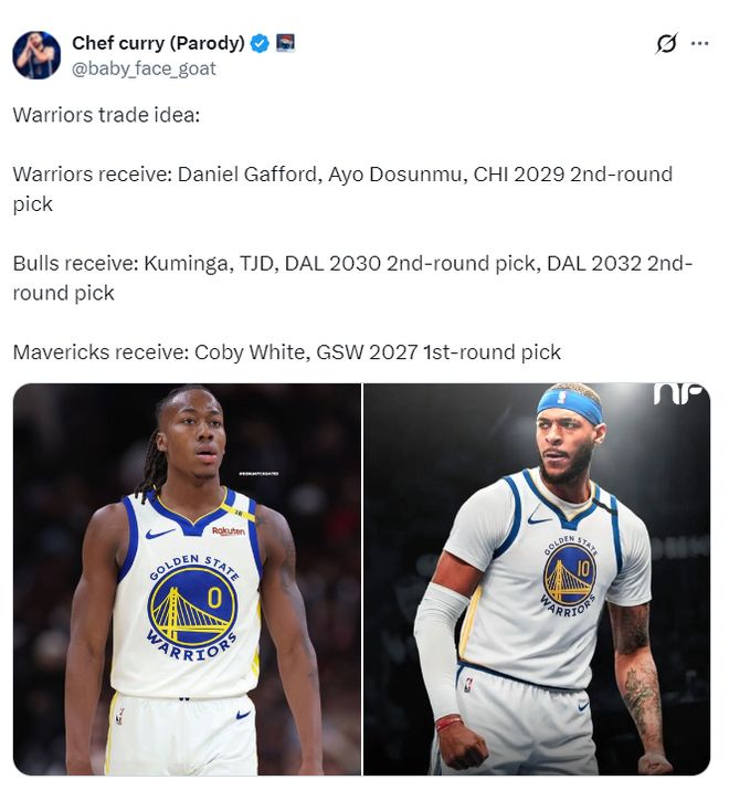 已經有勇媒為勇士模擬了交易得到加福德的方案,要拉入公牛作為第三方,這樣勇士可以同時得到多森姆、加福德兩位即戰力,但勇士需要送出庫明加、戴維斯、2027年的首輪簽。