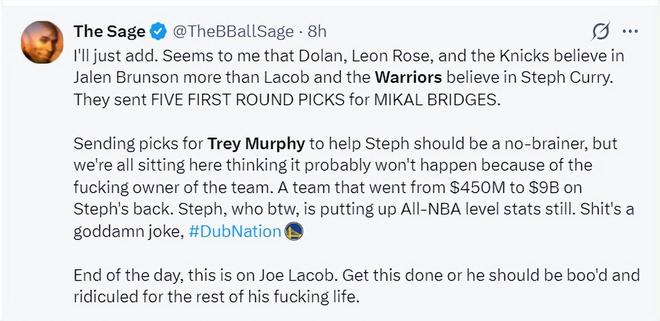 勇媒談到球隊的交易引援計劃,他抨擊了老板喬-拉科布過于吝嗇,他寫道:我想說一句,多蘭、萊昂-羅斯的尼克斯很看重布倫森,勇士的拉科布也看重庫里,可尼克斯為了幫助布倫森愿意犧牲4個首輪簽去換米卡爾-布里奇斯,勇士呢?
