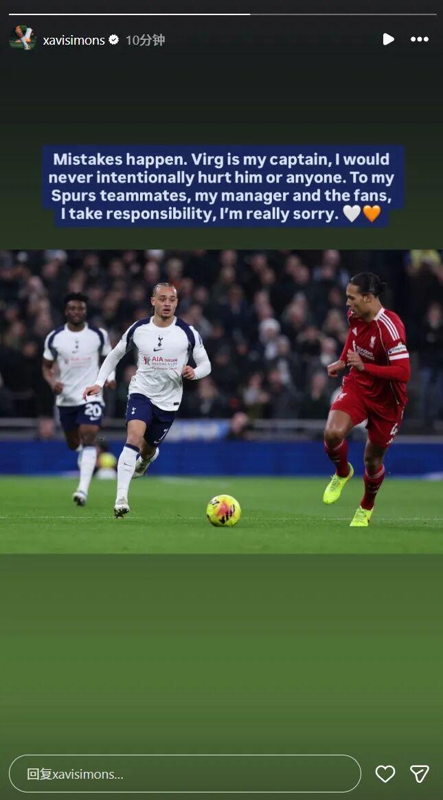 “犯錯在所難免,”西哈維-西蒙斯寫道。“范戴克是我的隊長,我絕不會故意傷害他或任何人。對熱刺的隊友、教練和球迷們,我承擔全部責任,真的很抱歉。”