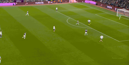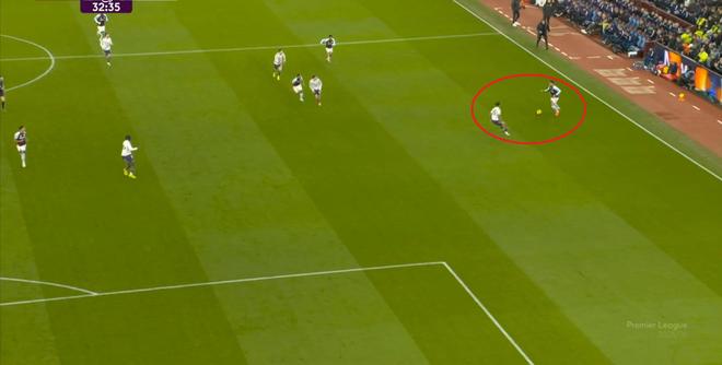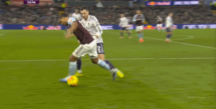 比賽第33分鐘,維拉在后場輕松起腳,沃特金斯和隊友在海文和烏加特的身上打出并保住優勢,從而將球權轉給了邊路的羅杰斯,讓他有了和約羅一對一的機會: