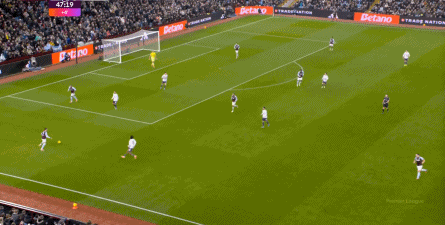 第45分鐘,維拉在中場完成搶斷,由來到中路的麥金頂住后衛線,聯系到羅杰斯,然后在一對一中擊倒了曼聯: